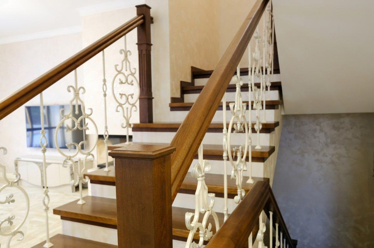 В основе дизайна лежит игра на контрастах. Массивные ступени и перила из темного, благородного дуба задают тон роскоши и надежности. Им противопоставлены изящные фигурные балясины белого цвета, которые придают конструкции визуальную легкость. Особый шик проекту добавляют подступенки, отделанные светлой декоративной штукатуркой, которые идеально перекликаются со светлой венецианской штукатуркой на стенах.