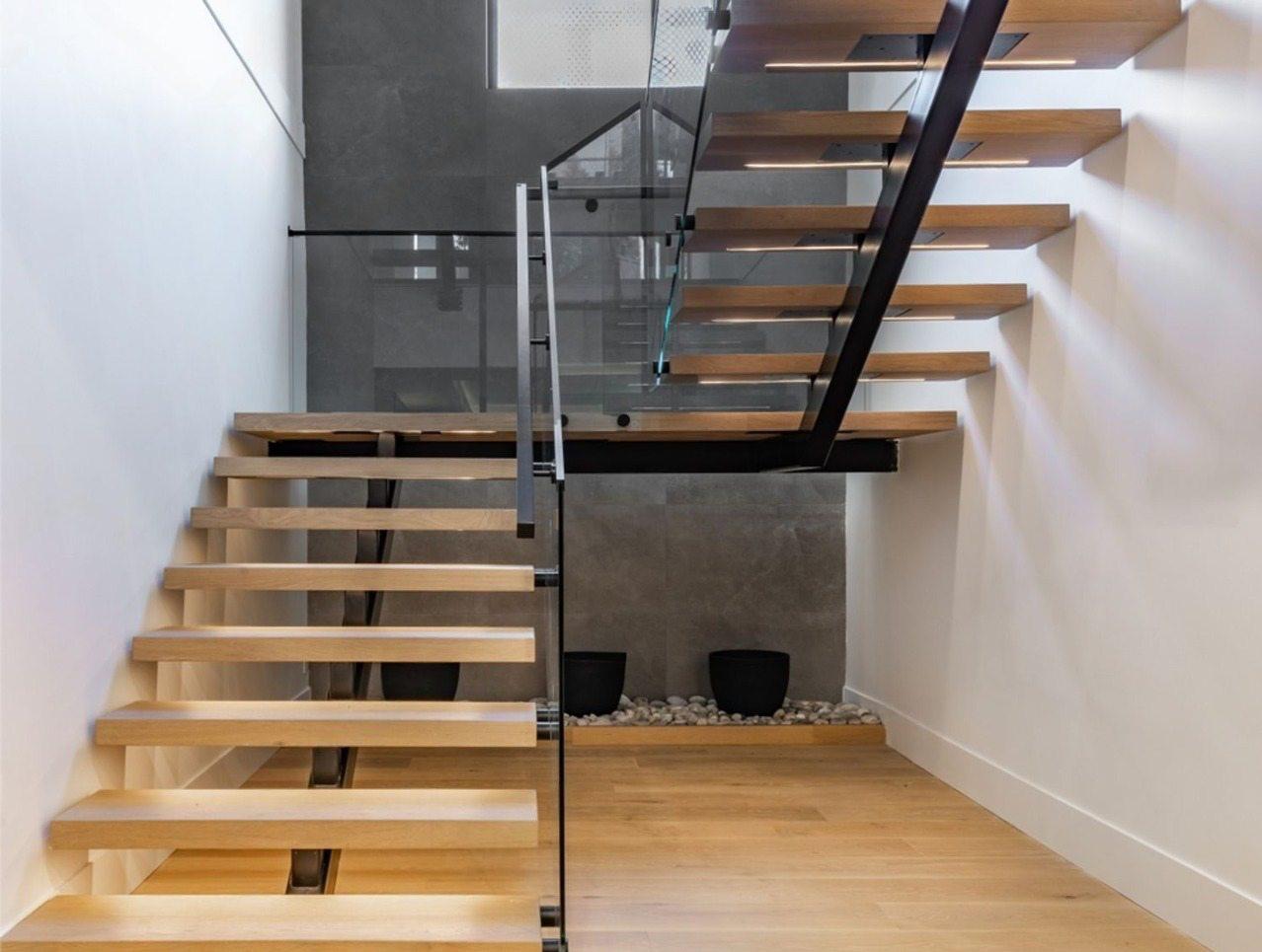 Визуальная легкость: что такое монокосоур? Монокосоур — это одна центральная металлическая балка, на которой держатся все ступени. Конструкция выглядит так, будто ступени парят в воздухе, создавая ощущение свободы и простора. Именно поэтому лестница на одном металлическом косоуре с деревянными ступенями идеально вписывается в современный интерьер.